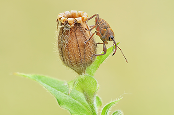 De grond ligt in de herfst bezaaid met heel wat moois. Wie goed kijkt, vindt behalve kastanjes en bladeren ook eikels met kleine gaatjes. Hierin huisde een kleine eikelboorder. Dit kleine kevertje behoort tot de groep van de snuitkevers, kevers die te herkennen zijn aan hun verlengde kop in de vorm van een snuit, waaraan kleine bijtende monddelen zitten om van planten of vruchten te snoepen. Halverwege de snuit bevinden zich geknikte antennes met een verdikt, knotsvormig uiteinde. Snuitkevers vormen overigens de grootste keverfamilie. Bijna 10.000 soorten zijn ondertussen bekend en beschreven, maar de kleine eikelboorder mag gaan lopen met de prijs voor ‘grootste cutie’ of met de award voor ‘meest bijzondere levenswijze’.