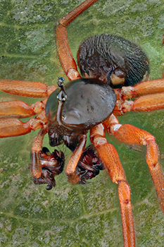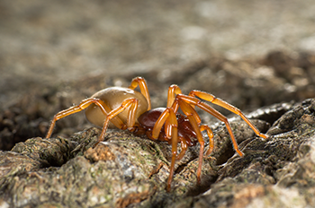 Dit oranje-vleeskleurig spinnetje ziet er wat eng uit en kan als één van de weinige inheemse spinnensoorten door een mensenhuid bijten, al is dat zonder grote gevolgen. We hebben het over de rood-witte celspin! Bij gevaar neemt deze spin meteen een dreighouding aan: ze opent haar grote kaken en steekt haar kopborststuk omhoog. Zo lijkt ze net op een slechtgehumeurde kreeft of schorpioen. Roodwitte celspinnen kunnen aardig bijten met hun forse giftanden of kaken. Dat moet ook wel, want hun favoriete maaltijd bestaat uit pissebedden met een hard uitwendig skelet. Om die te verorberen komen de lange giftanden van de spin goed van pas. Ze worden ingezet als een soort hefboom: de pissebed wordt opgetild en de spin injecteert haar gif in de zachte buikdelen van haar prooi. Mannetjes van deze spinnensoort zijn trouwens niet vies van wat onderlinge concurrentie. Om een vrouwtje voor zich te winnen, meten ze hun gifkaken tegen elkaar af. Het mannetje met de grootste kaken gaat er met het vrouwtje vandoor. Kortom: ook in de bodem leven er ‘patsers’.